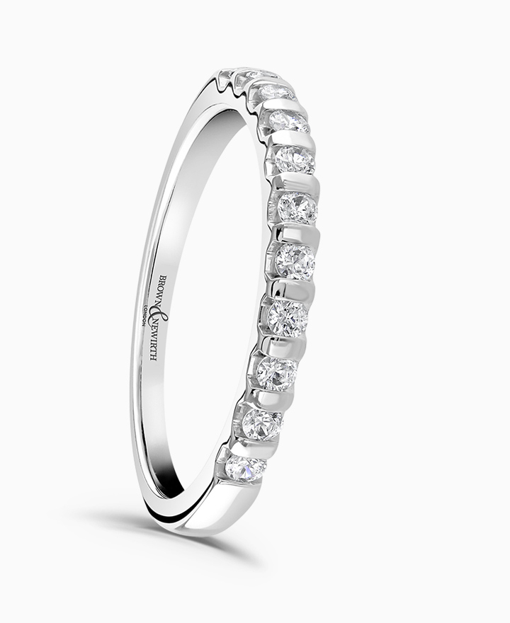 Handcrafted by Brown & Newirth; a total of 0.15ct of round brilliant cut diamonds adorn 45% of this square edged band. Total carat weight 0.15ct