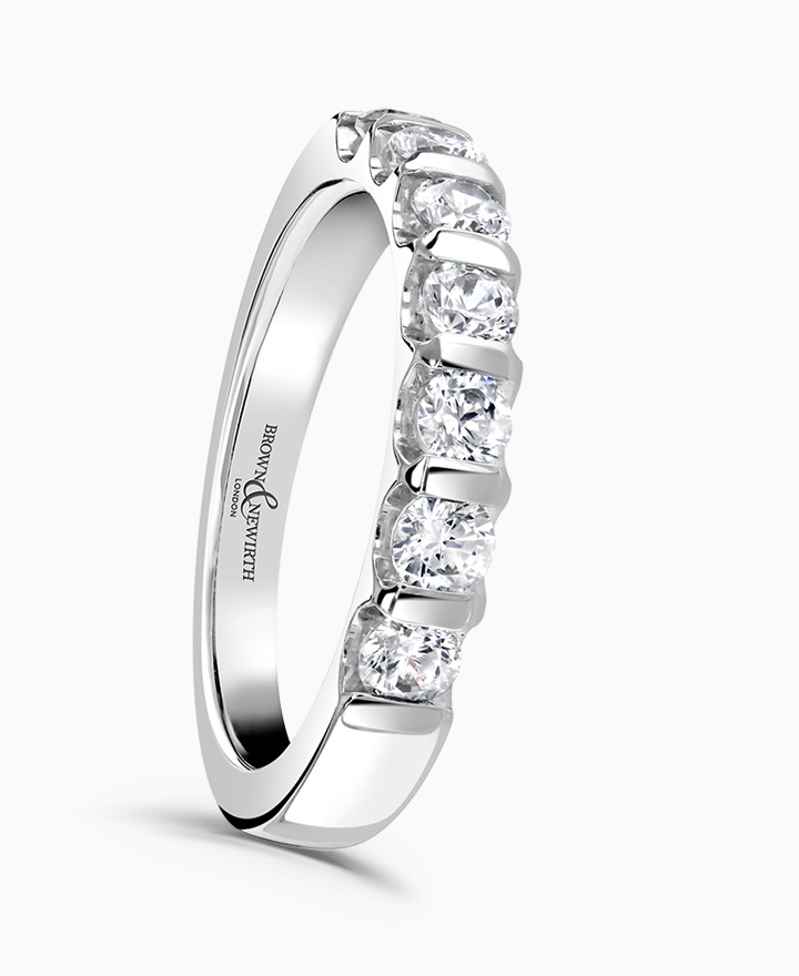 Handcrafted by Brown & Newirth; a total of 1.60ct of round brilliant cut diamonds adorn 40% of this square edged band. Total carat weight 1.60ct