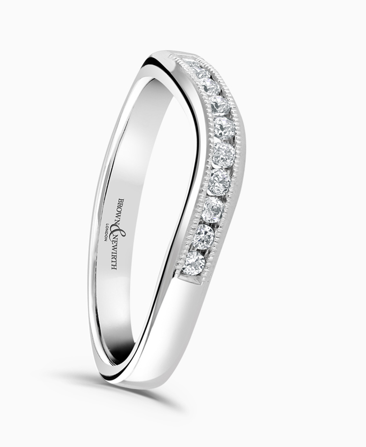 Handcrafted by Brown & Newirth; round brilliant cut diamonds flow through a curved top edge adorning 50% of this straight edged band finished with a mill grain edge. Total carat weight 0.25ct