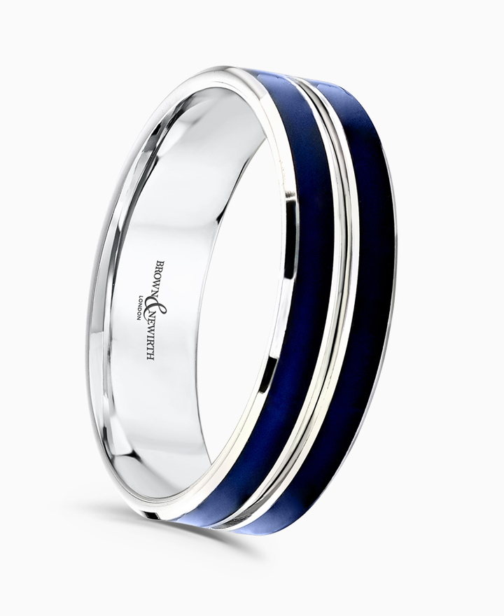 Handcrafted by Brown & Newirth; our flat top profile with centre channel, rolled edges and two intense navy ceramic inlays, presented in a medium gauge.