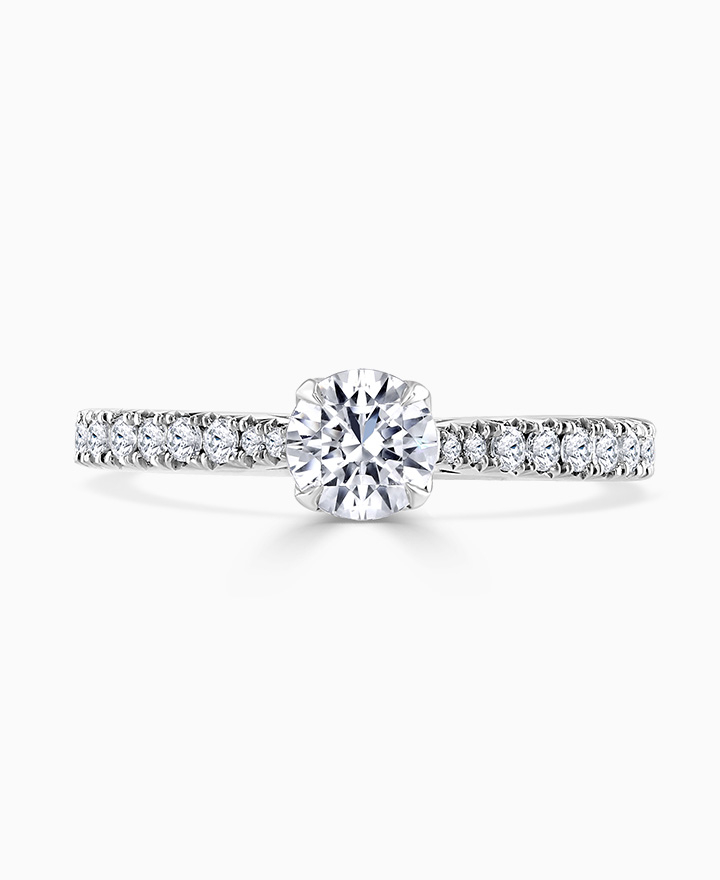 Handcrafted by Brown & Newirth; our signature 'bloom' floral detailing for a 0.50ct round brilliant cut diamond, presented here with diamond set shoulders and a total 0.73ct. Part of the Bloom Collection.