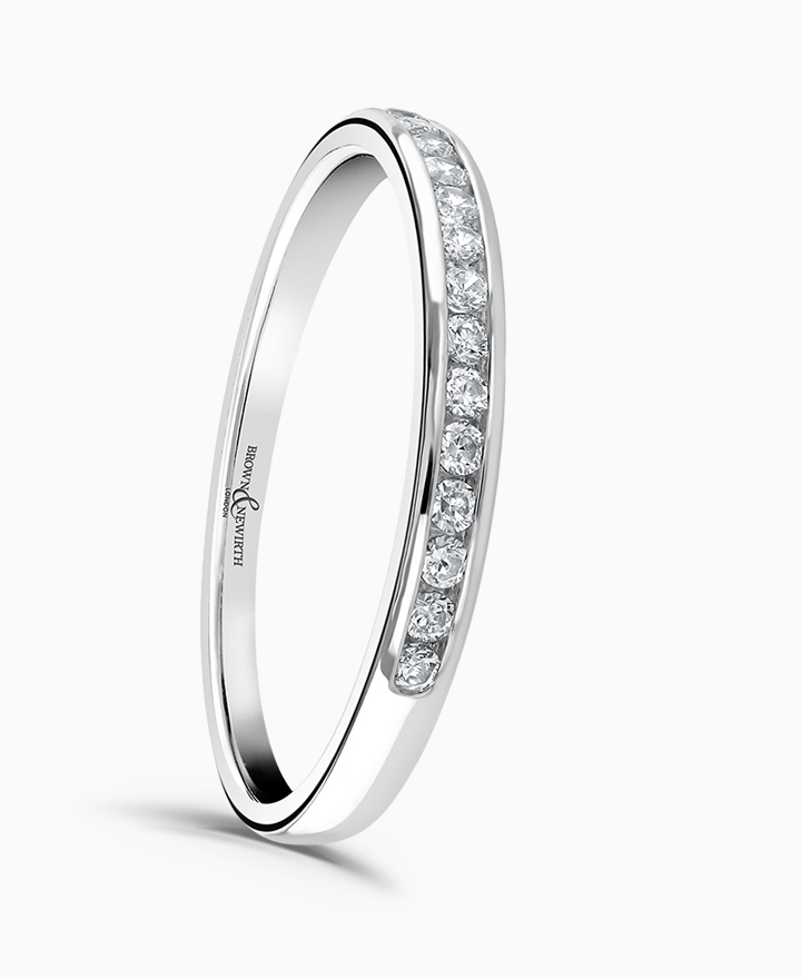 Handcrafted by Brown & Newirth; round brilliant cut diamonds totalling 0.25ct adorn 40% of this classic court band. Total carat weight 0.25ct