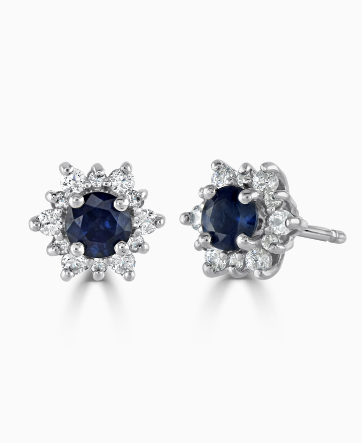 Handcrafted by Brown & Newirth; our open set round brilliant blue sapphire stud earrings, framed with snowflake diamond halo