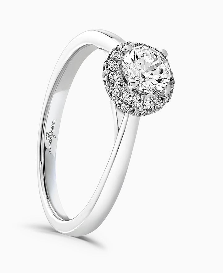 Handcrafted by Brown & Newirth; a diamond halo with additional side-set diamonds frames the 0.50ct round brilliant cut diamond, presented here with diamond set shoulders. Total 0.64ct.