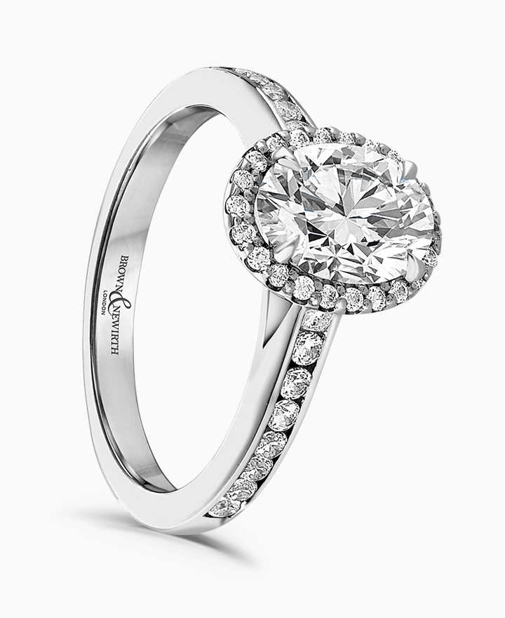 Handcrafted by Brown & Newirth; our signature 'bloom' floral detailing with diamond halo framing a 0.50ct oval cut diamond, presented here on a diamond set band. Total 0.72ct. Part of the Bloom Collection.