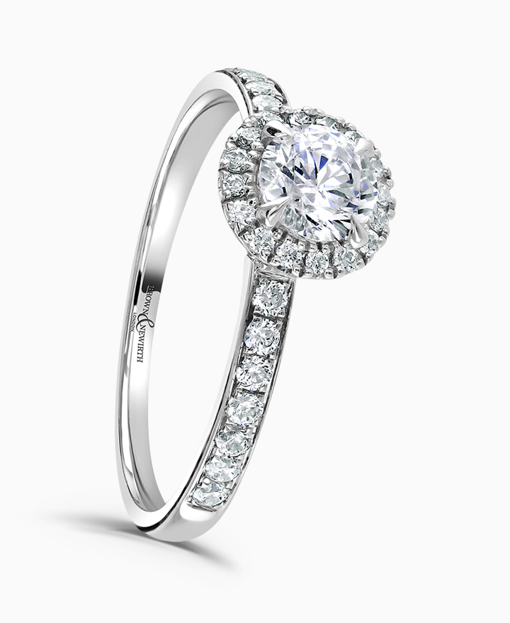 Handcrafted by Brown & Newirth; a diamond halo frames the 0.25ct round brilliant cut diamond, presented here with diamond set shoulders. Total 0.60ct.
