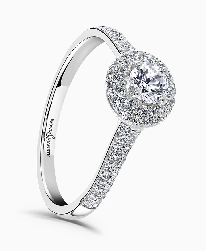 Handcrafted by Brown & Newirth; a double-row diamond halo frames the 0.33ct round brilliant cut diamond, presented here with double row diamond set shoulders. Total 0.64ct