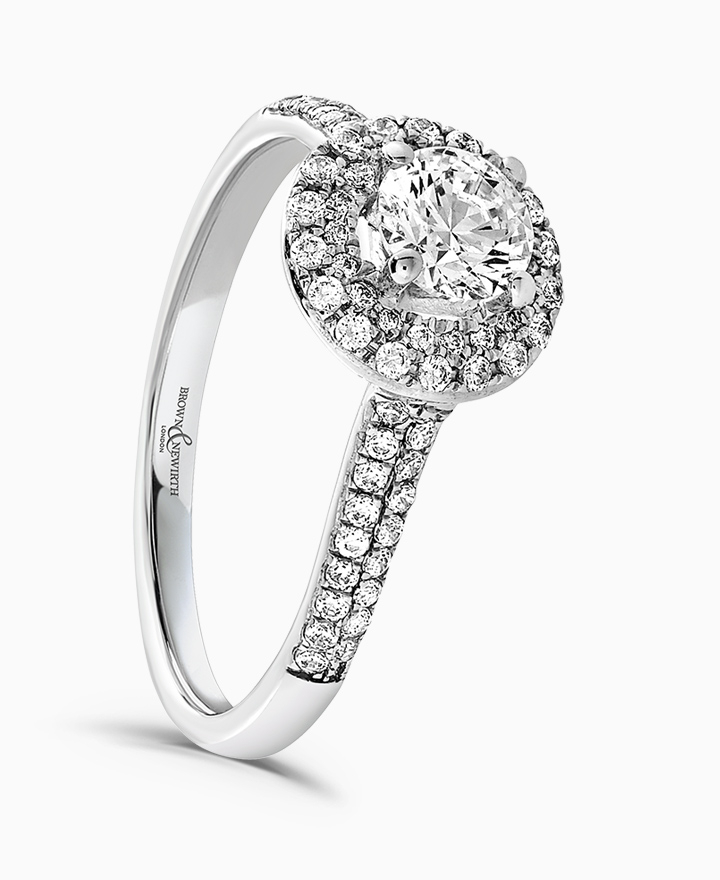 Handcrafted by Brown & Newirth; a double-row diamond halo frames the 0.50ct round brilliant cut diamond, presented here with double row diamond set shoulders. Total 0.79ct.