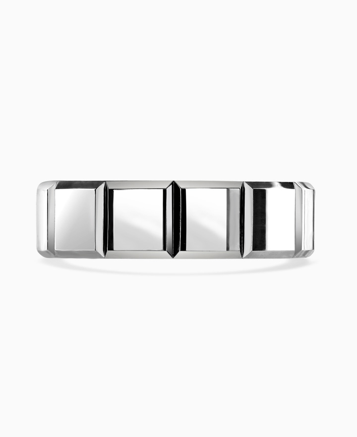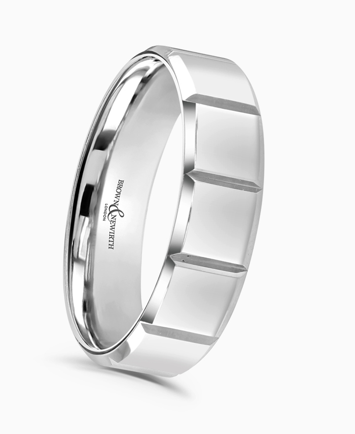 Handcrafted by Brown & Newirth; our flat top profile with cube patterning and square edges, presented in a medium gauge. Part of the Chocolate Collection