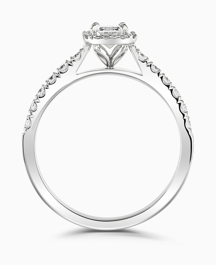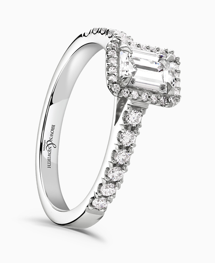 Handcrafted by Brown & Newirth; our signature 'bloom' floral detailing with diamond halo framing a rectangular emerald cut diamond, presented here on a diamond set band. Centre 0.50ct, total 0.72ct. Part of the Bloom Collection.