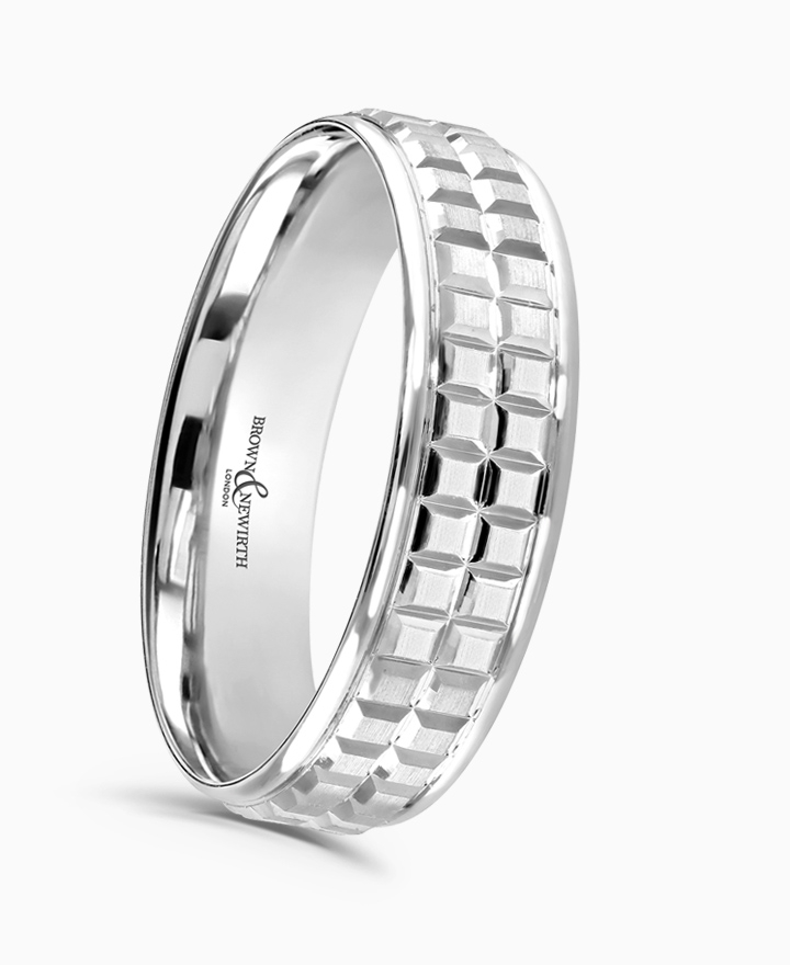 Handcrafted by Brown & Newirth; our flat top profile with brushed cube patterning and rolled edges, presented in a medium gauge. Part of the Chocolate Collection