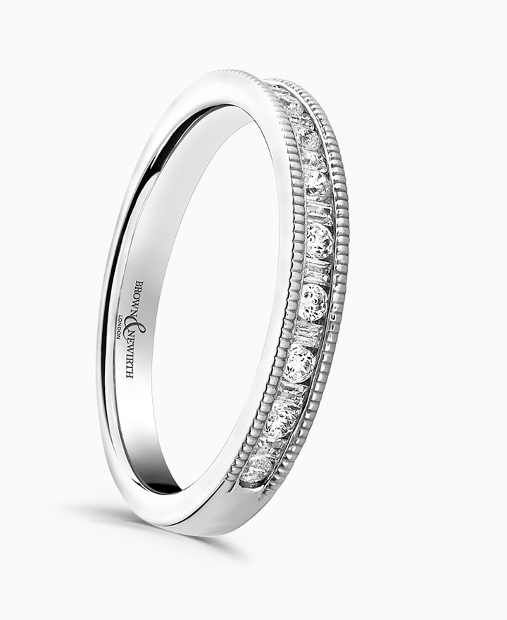 Handcrafted by Brown & Newirth; a captivating mix of rectangular baguette and round brilliant cut diamonds adorn 40% of this square edged band with mill grain detailing. Total carat weight 0.25ct