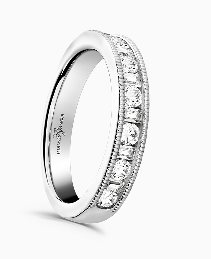Handcrafted by Brown & Newirth; a captivating mix of rectangular baguette and round brilliant cut diamonds adorn 40% of this square edged band with mill grain detailing. Total carat weight 0.63ct