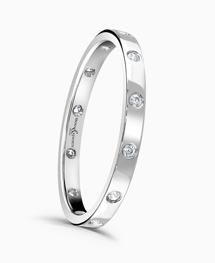 Handcrafted by Brown & Newirth; round brilliant diamonds bezel set around the full hoop, presented in a modern court band. Total carat weight 0.13ct