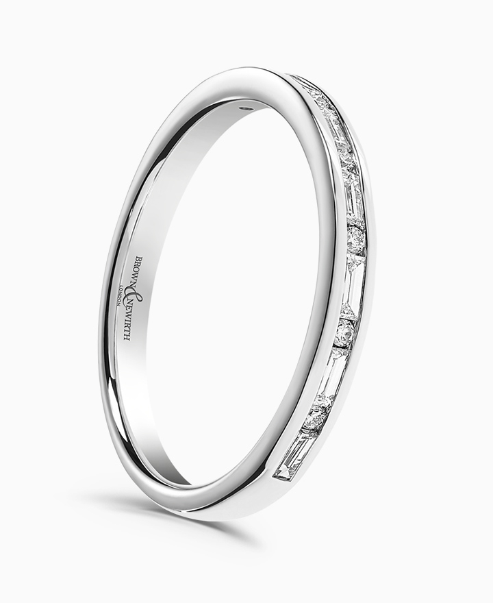 Handcrafted by Brown & Newirth; a captivating mix of rectangular baguette and round brilliant cut diamonds adorn 45% of this square edged band. Total carat weight 0.25ct