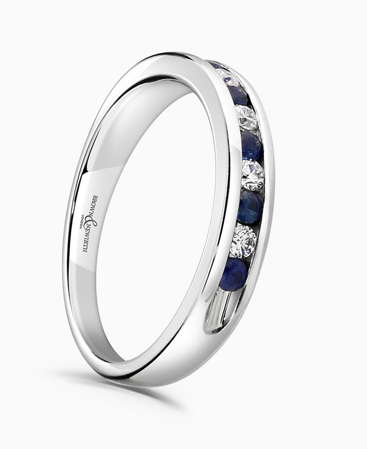 Handcrafted by Brown & Newirth; round brilliant cut diamonds and blue sapphires adorn 33% of this classic court band. Total carat weight 0.33ct