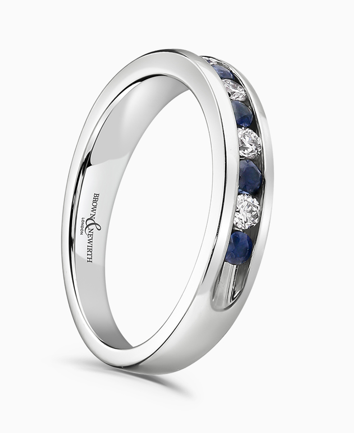 Handcrafted by Brown & Newirth; round brilliant cut diamonds and blue sapphires adorn 40% of this classic court band. Total carat weight 0.50ct