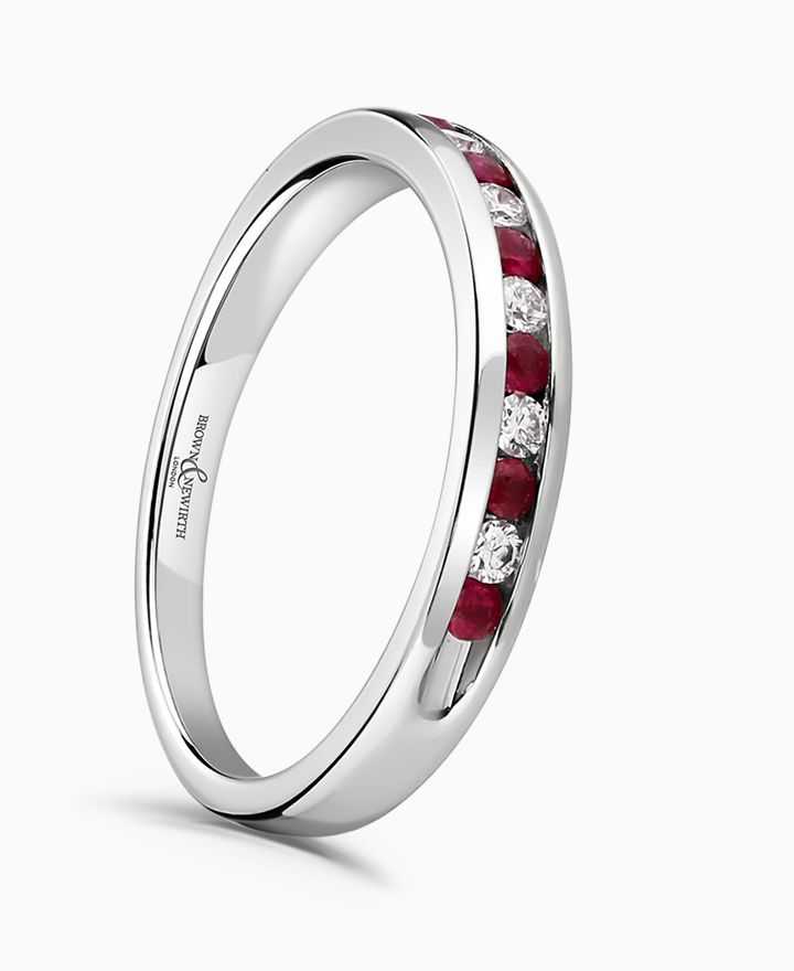 Handcrafted by Brown & Newirth; round brilliant cut diamonds and red rubies adorn 33% of this classic court band. Total carat weight 0.25ct