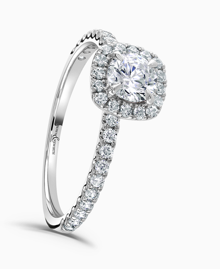 Handcrafted by Brown & Newirth; a squared diamond halo frames the round brilliant cut diamond, presented here with diamond set shoulders. Centre 0.50ct, total 0.85ct.