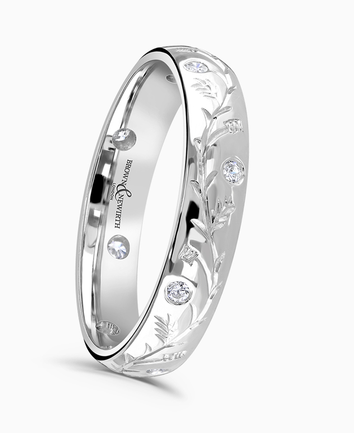 Handcrafted by Brown & Newirth; scattered round brilliant diamonds set around the full hoop and decorated with petal detailing, presented in a classic court band. Total carat weight 0.12ct