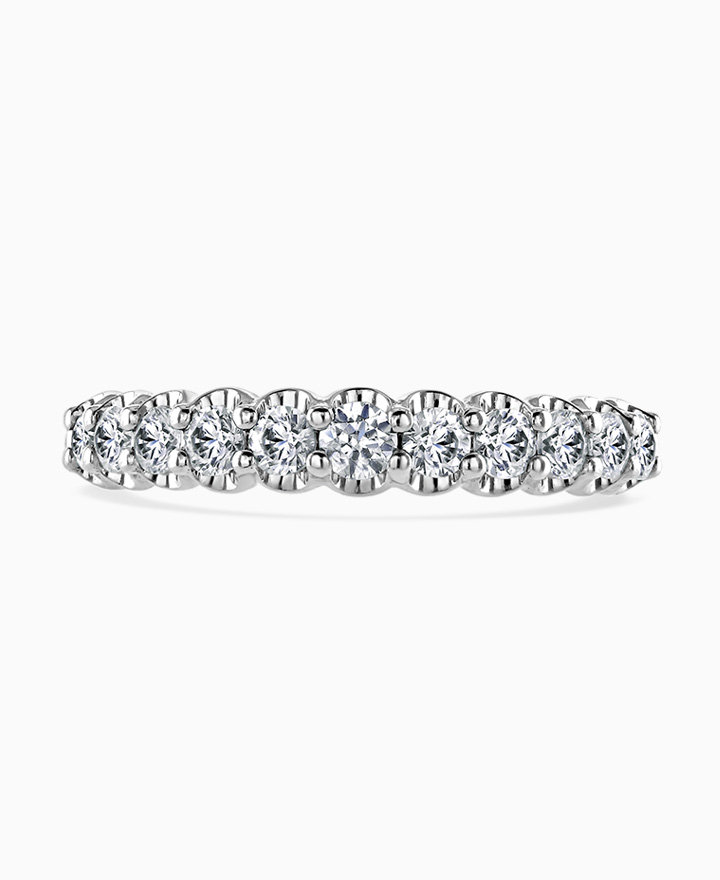 Handcrafted by Brown & Newirth; a cupped claw setting of round brilliant cut diamonds covering 50% of a classic court band. Total carat weight 0.75ct