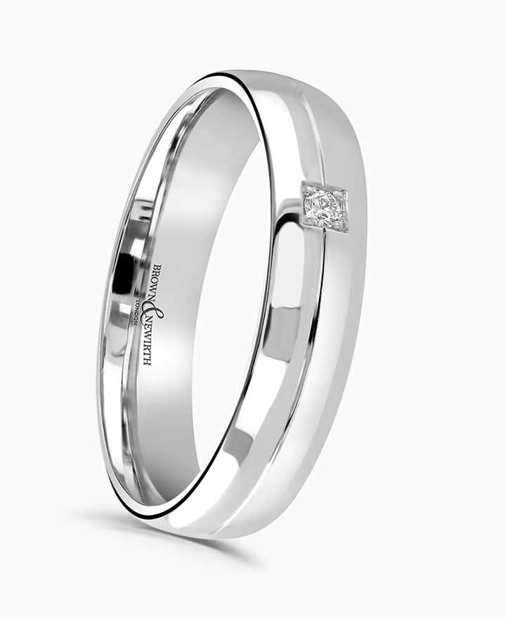 Handcrafted by Brown & Newirth; a single round brilliant cut diamond set between contrasting finishes, presented on a modern court band. Total carat weight 0.03ct