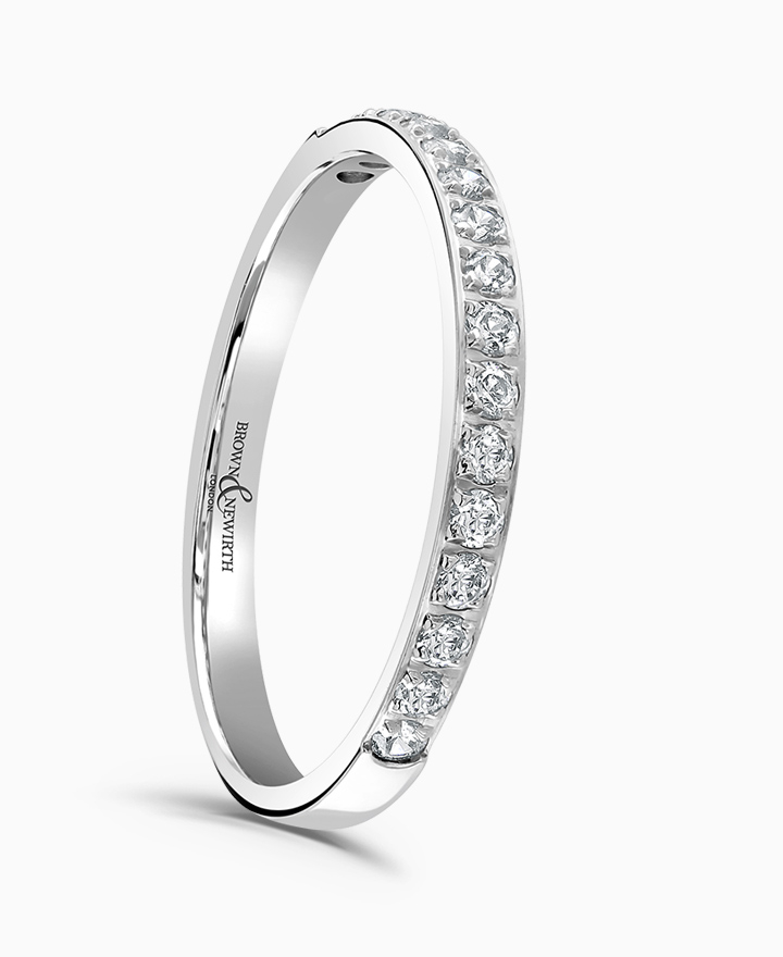 Handcrafted by Brown & Newirth; round brilliant cut diamonds adorn 50% of this modern court band. Total carat weight 0.25ct