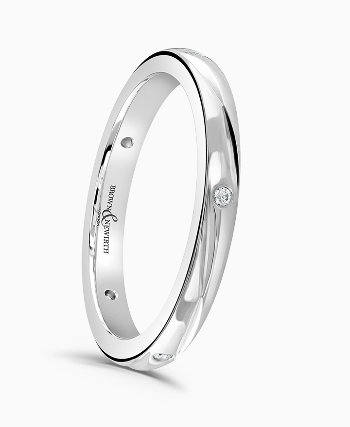 Handcrafted by Brown & Newirth; pairs of round brilliant diamonds set with sweeping lines around the full hoop, presented in a D-shaped band. Total carat weight 0.03ct