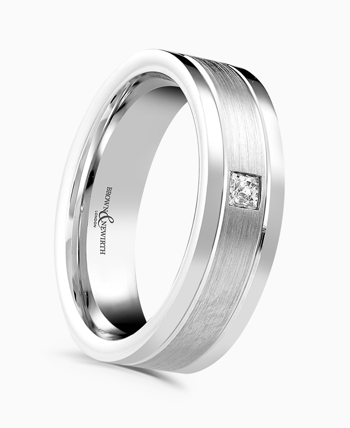 Handcrafted by Brown & Newirth; a bezel set square princess cut diamond set in matte centre with contrasting polished edges, presented on a flat top band. Total carat weight 0.08ct