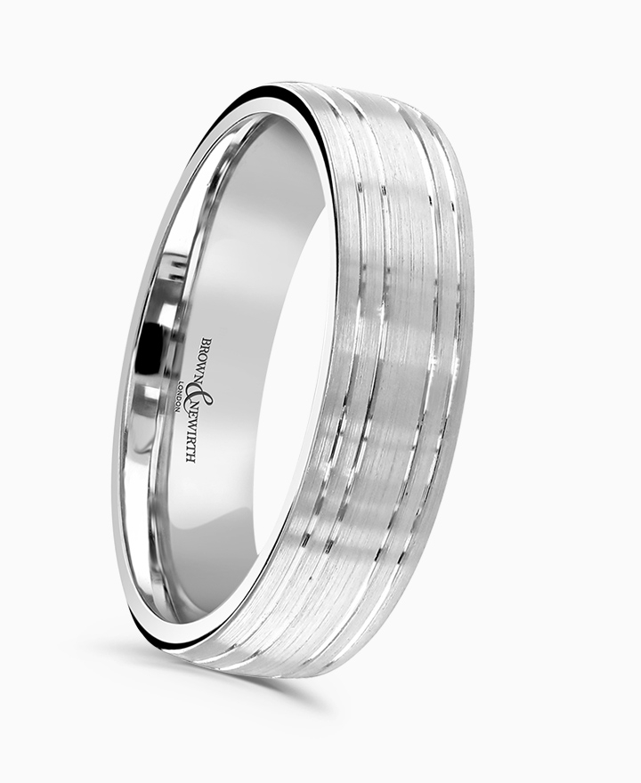 Handcrafted by Brown & Newirth; our modern court profile in a brushed finish features contrasting v-cut detailing, presented in a medium gauge.