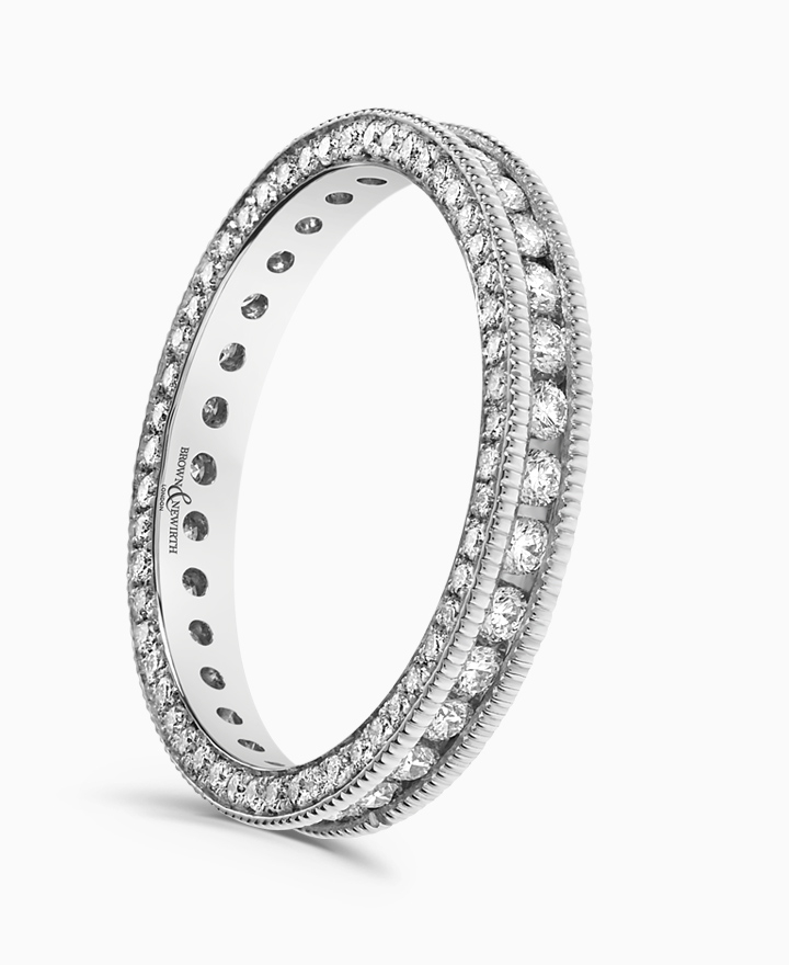 Handcrafted by Brown & Newirth; a full hoop of round brilliant diamonds elevated by matching side-set diamonds finished with a mill grain edge. Part of the Opulence Collection. Total carat weight 1.00ct