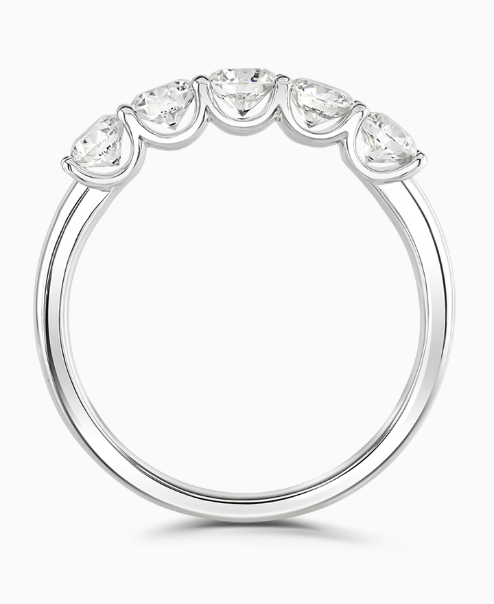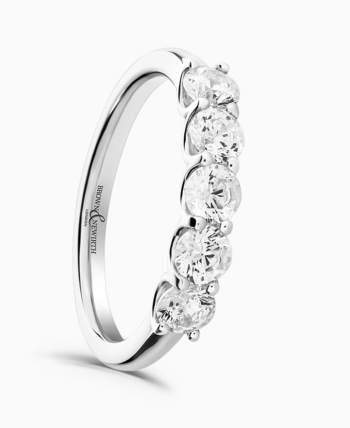 Handcrafted by Brown & Newirth; a cupped claw setting elevates these five round brilliant cut diamonds, presented here on a classic court band. Five 0.20ct, total 1.00ct