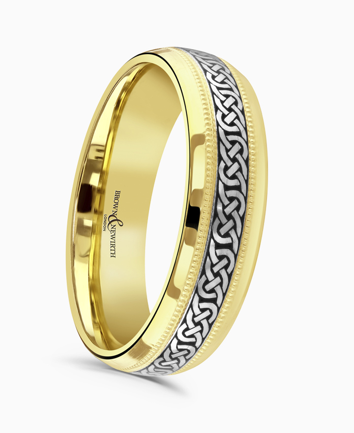 Handcrafted by Brown & Newirth; our classic Celtic design on a court profile with contrasting edges and mill grain detail, presented in a medium gauge.