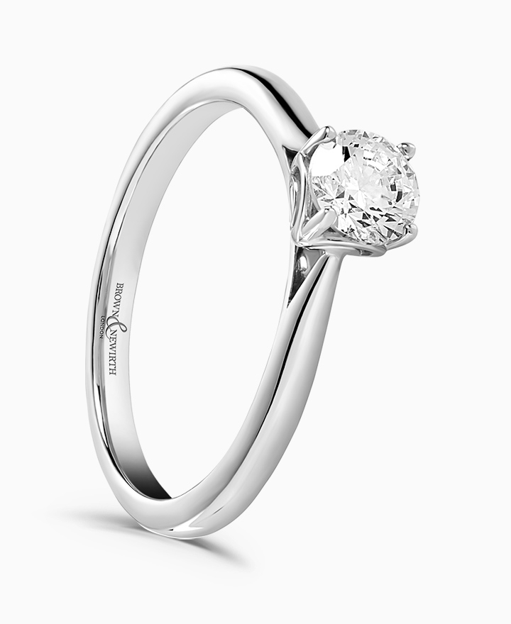 Handcrafted by Brown & Newirth; a delicate four claw setting with floral detailing perfectly elevates the round brilliant cut diamond, presented here on a classic court band. 0.50ct