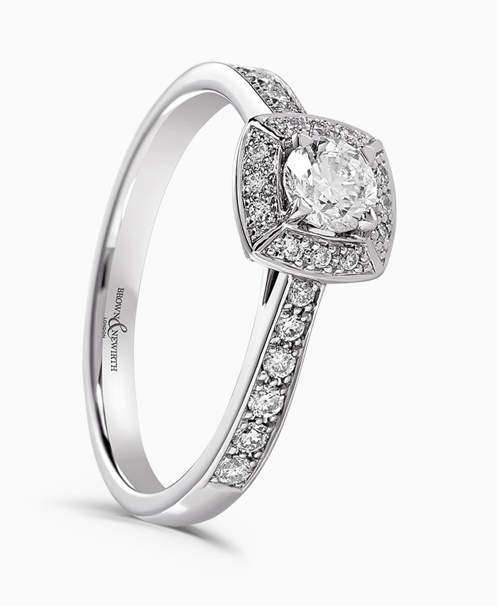 Handcrafted by Brown & Newirth; a pave set halo perfectly frames a claw set round brilliant cut diamond, presented here on a diamond set band. Centre 0.30ct, total 0.58ct.