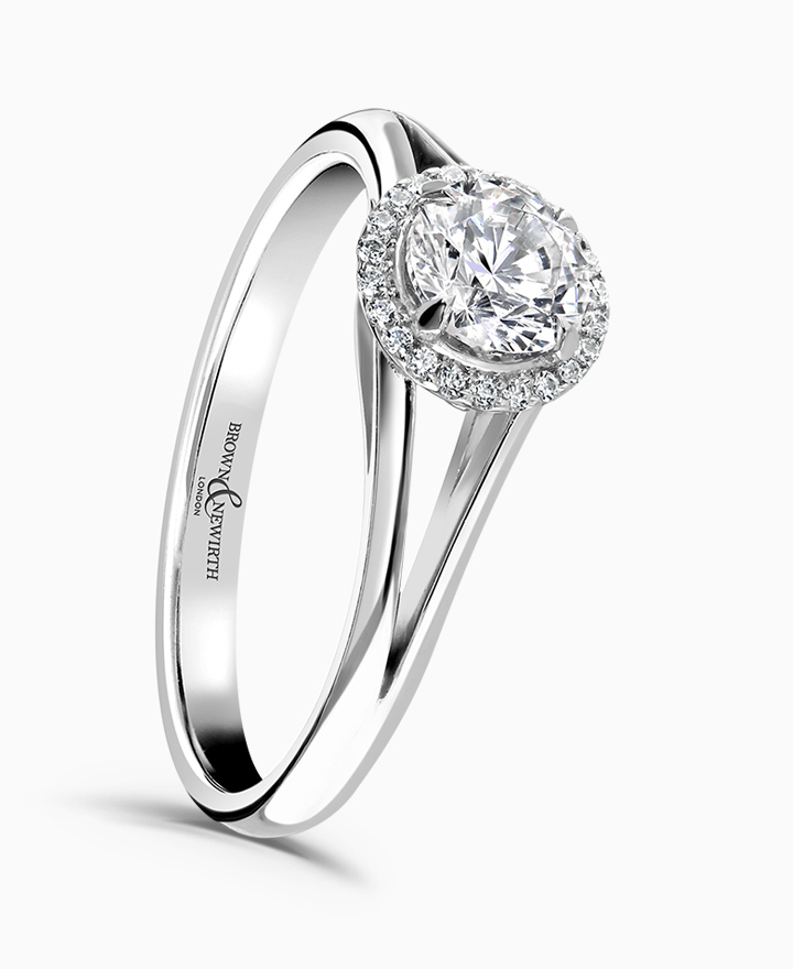 Handcrafted by Brown & Newirth; our signature 'bloom' floral detailing with diamond halo framing a round brilliant cut diamond, presented here on a split open shoulder band. Centre 0.50ct, total 0.54ct. Part of the Bloom Collection.