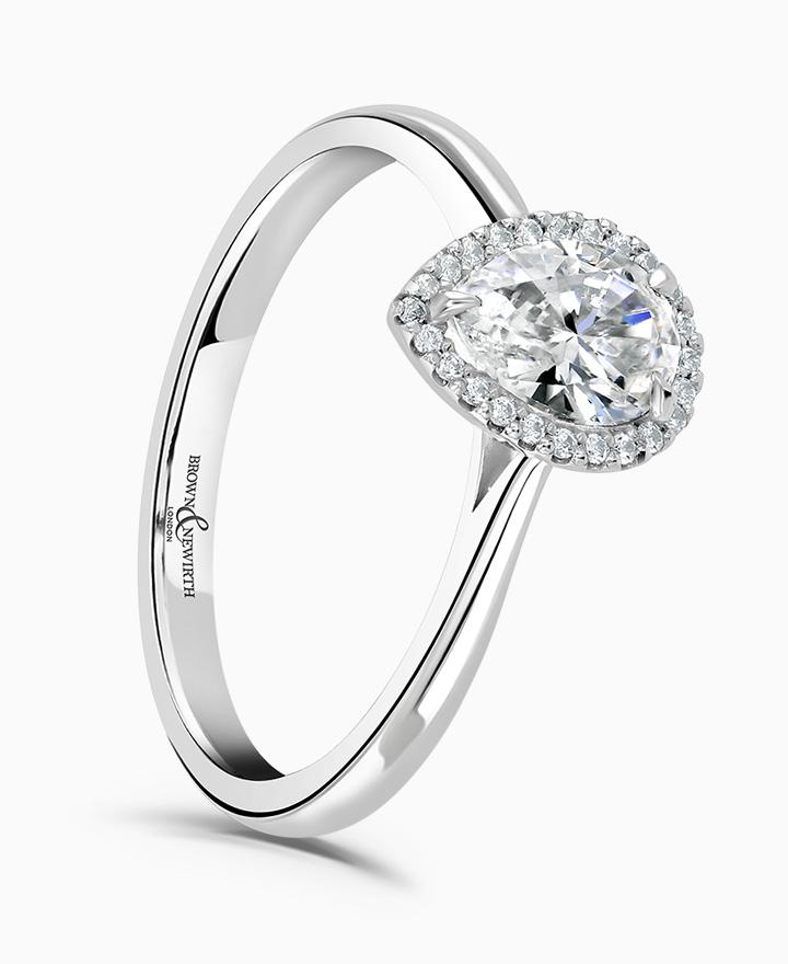 Handcrafted by Brown & Newirth; our signature 'bloom' floral detailing with diamond halo framing a pear cut diamond, presented on a classic court band. Centre 0.50ct, total 0.55ct. Part of our in stock range, order today for quick delivery.