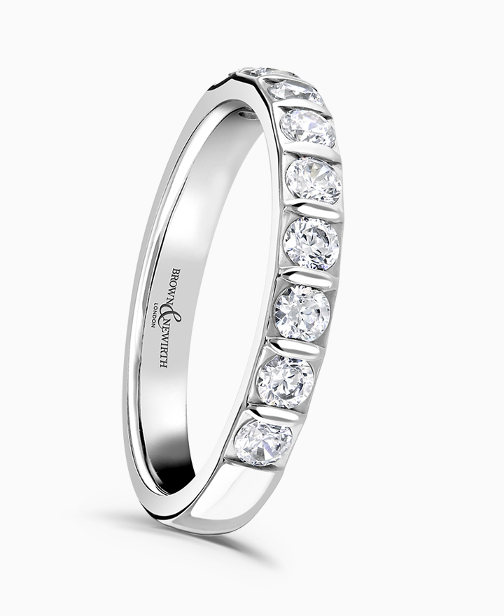 Handcrafted by Brown & Newirth; round brilliant cut diamonds adorn 40% of this classic court band. Total carat weight 0.75ct