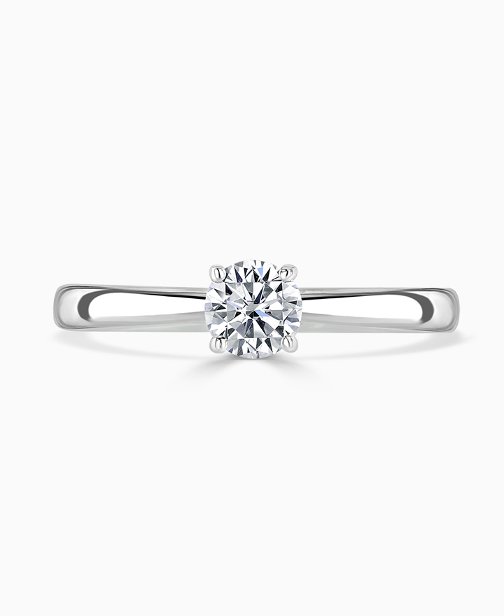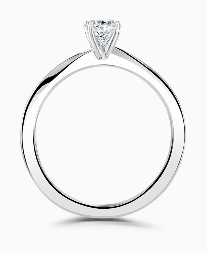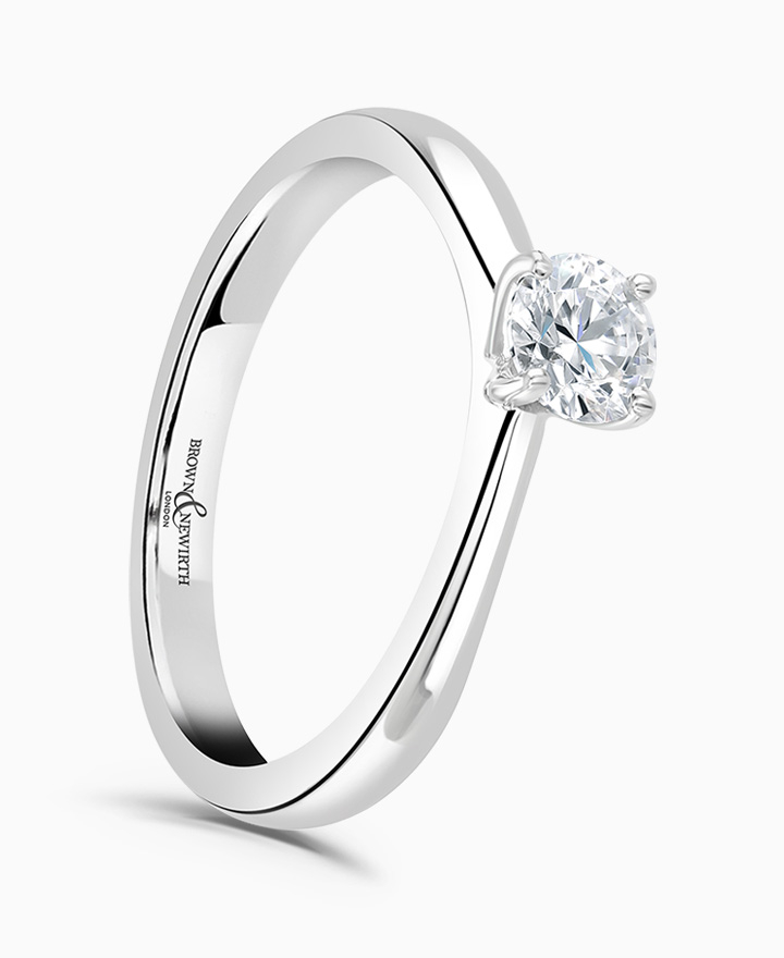 Handcrafted by Brown & Newirth; a delicate four claw setting perfectly elevates the round brilliant cut diamond, presented here on a band with twisted shoulder detail. 0.40ct