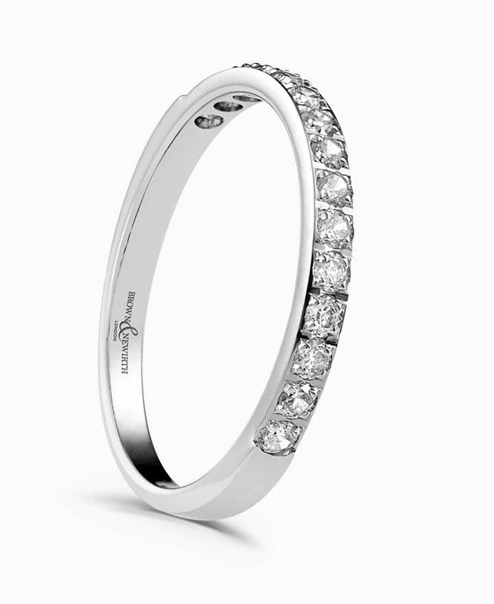 Handcrafted by Brown & Newirth; round brilliant cut diamonds adorn 45% of this modern court band. Total carat weight 0.25ct. This is part of our in stock range, available in platinum & 18ct yellow gold. Order today for quick delivery.