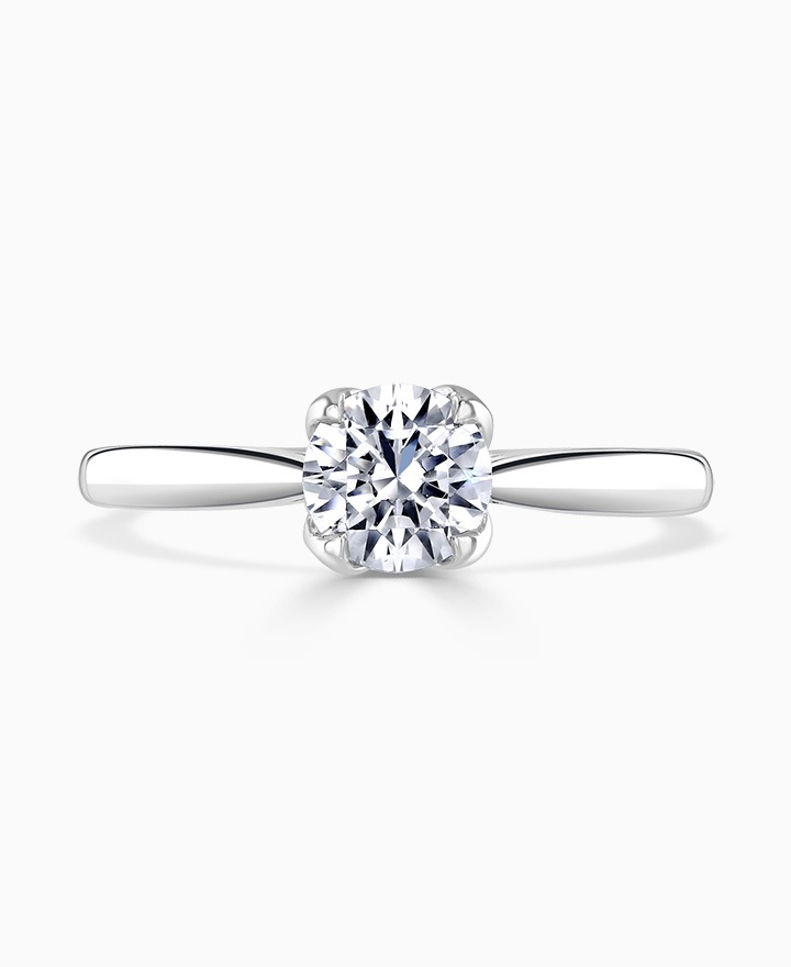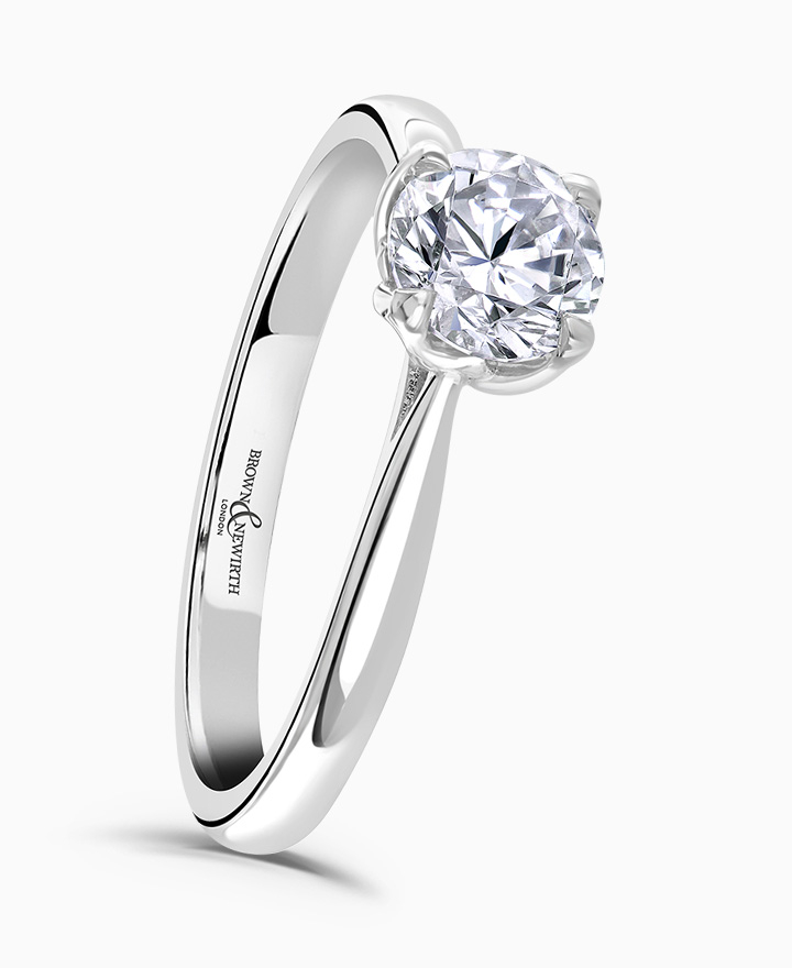Handcrafted by Brown & Newirth; our signature 'bloom' floral detailing for a round brilliant cut diamond, presented here on a classic court band. 0.75ct. Part of the Bloom Collection.