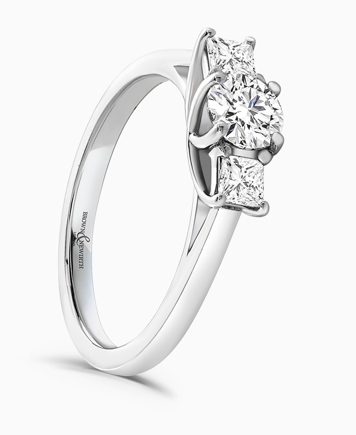 Handcrafted by Brown & Newirth; a sweeping claw set trilogy with square princess cut diamonds sitting either side of a round brilliant cut diamond, presented here on a straight edged band. Centre 0.50ct, total 0.80ct.