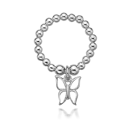 Super fly and super cute, Dollie’s Baby Butterfly Charm ring is the ultimate accessory. Made with sterling silver beads and a silver charm, its shown here in Medium size. Team with a stack of Dollie Rings to make sure your finger candy is on point.