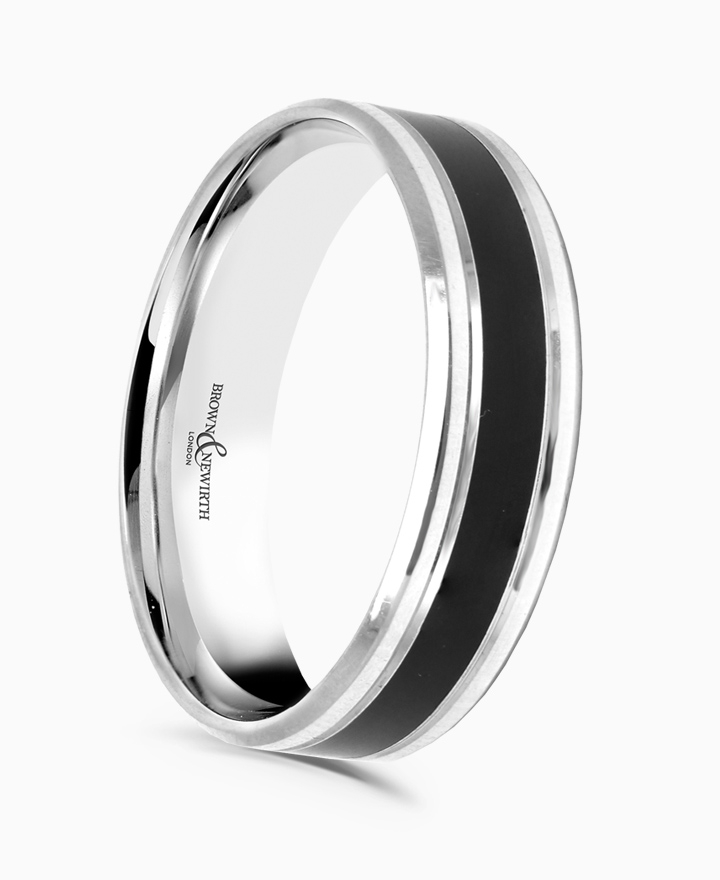 Handcrafted by Brown & Newirth; our flat top profile with black ceramic inlay framed with v-cuts and bevelled edges, presented in a medium gauge.