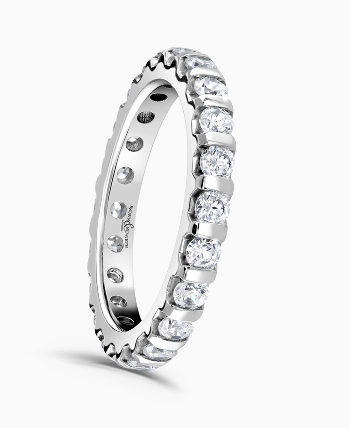 Handcrafted by Brown & Newirth; round brilliant cut diamonds adorn the full hoop of this square edged band. Total carat weight 1.5ct