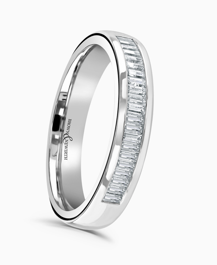 Handcrafted by Brown & Newirth; rectangular baguette cut diamonds sit edge to edge adorning 35% of this straight edged band. Total carat weight 1.00ct