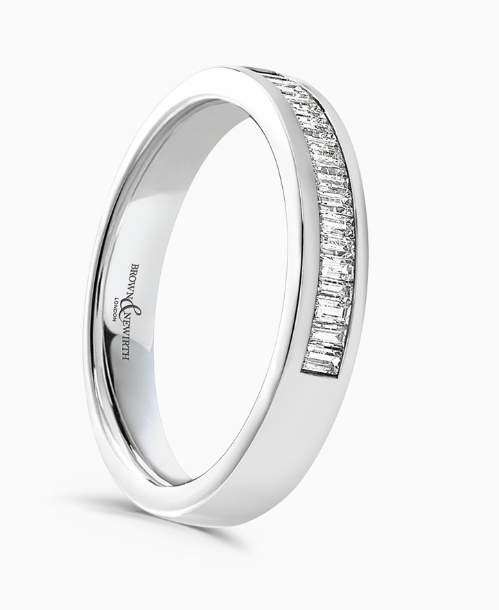 Handcrafted by Brown & Newirth; rectangular baguette cut diamonds sit edge to edge adorning 30% of this straight edged band. Total carat weight 0.50ct
