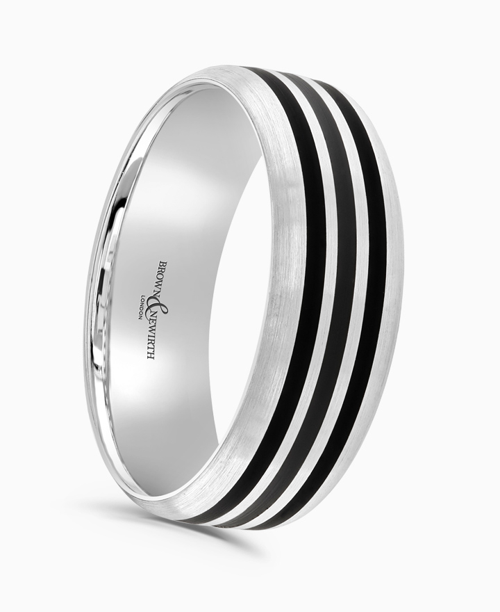 Handcrafted by Brown & Newirth; our flat top profile with rolled edges and three ceramic inlays; two in black and one in grey. Presented in a medium gauge.