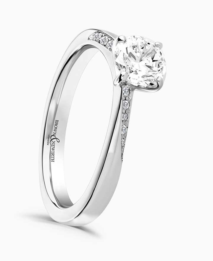 Handcrafted by Brown & Newirth; a delicate four claw setting perfectly elevates the round brilliant cut G Vs diamond, presented here on a band with twisted diamond set shoulder detail. Centre 0.33ct, total 0.39ct.