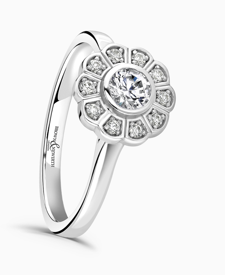 Handcrafted by Brown & Newirth; a diamond halo in art deco style frames the round brilliant cut diamond, presented here on a straight edged band. Centre 0.25ct, total 0.35ct. Part of the Vintage Collection